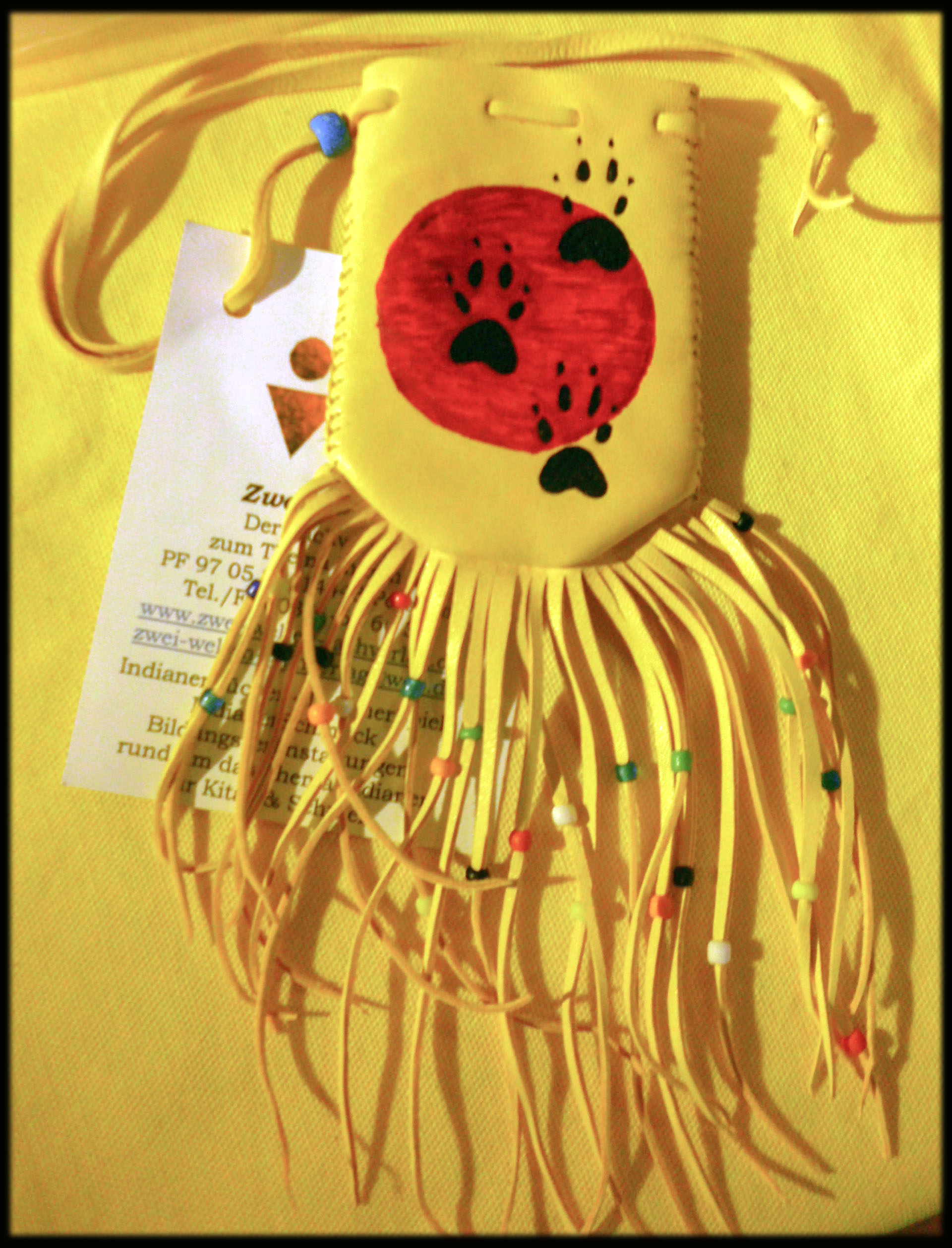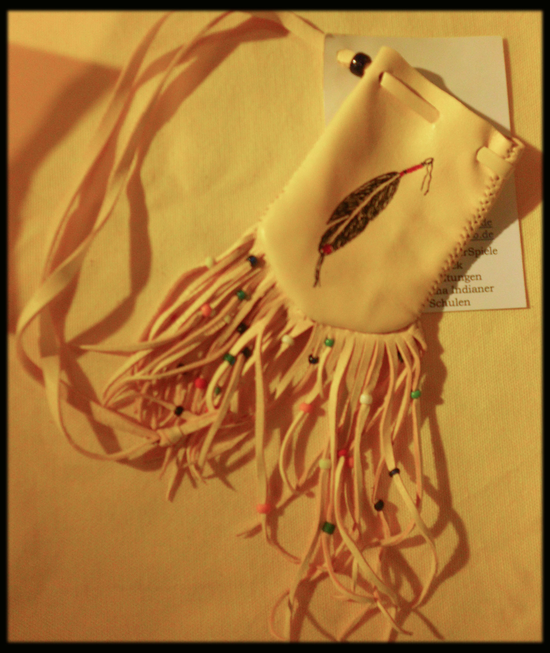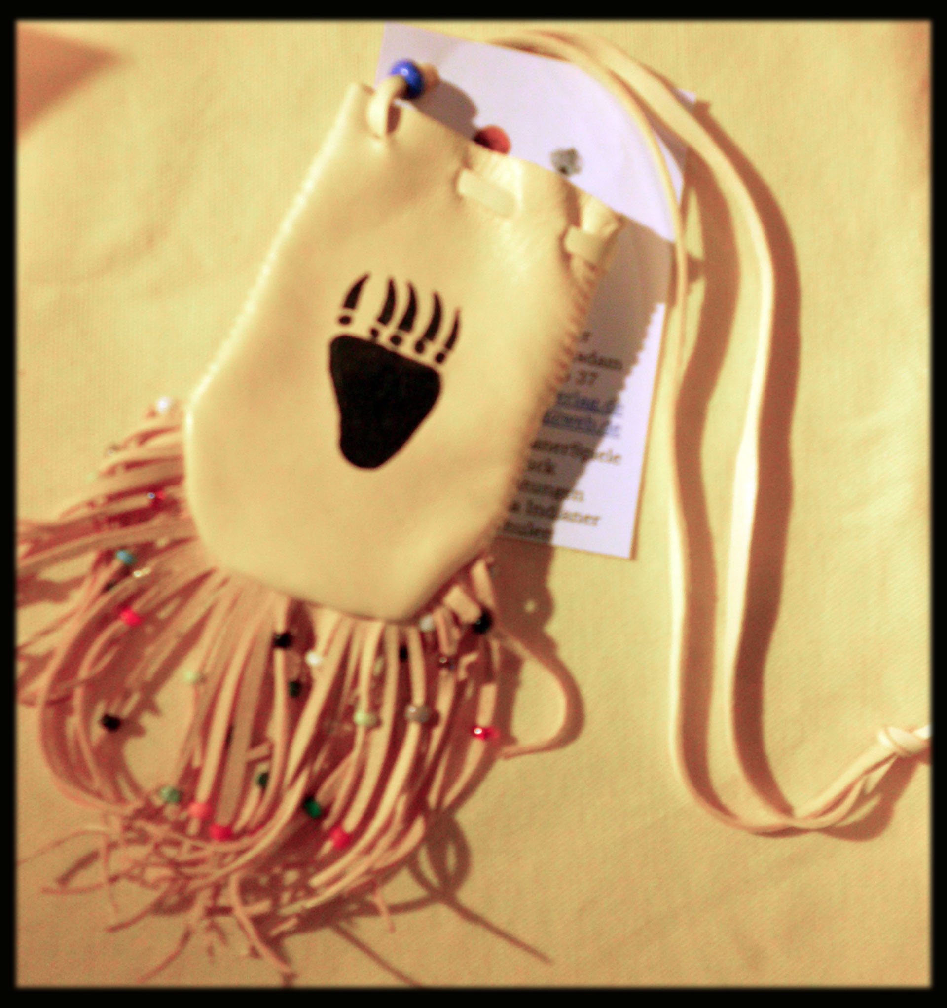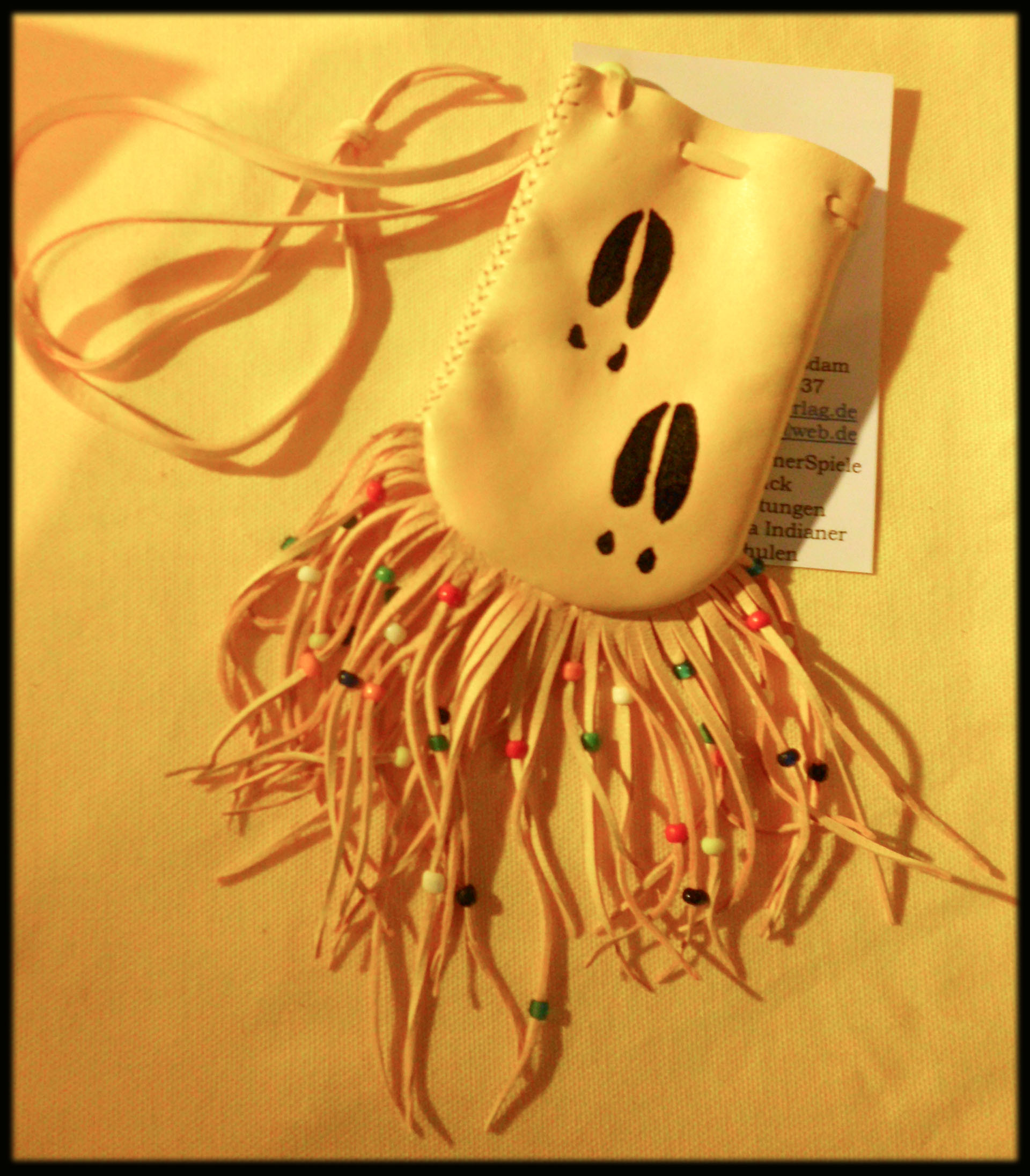 Kleine Lederbeutelchen, gefüllt mit Gegenständen, die für den Träger eine Bedeutung haben, nennt man Medizinbeutel. Unsere kleinen Ledertäschchen sind aus natürlich gegerbtem Rehleder hergestellt, mit Sehne genäht und Glasperlen sowie einem Symbol geschmückt. Mit Erläuterung. Alle Beutelchen sind Unikate und werden in Handarbeit hergestellt. Farbabweichungen des Leders und der Perlen möglich.