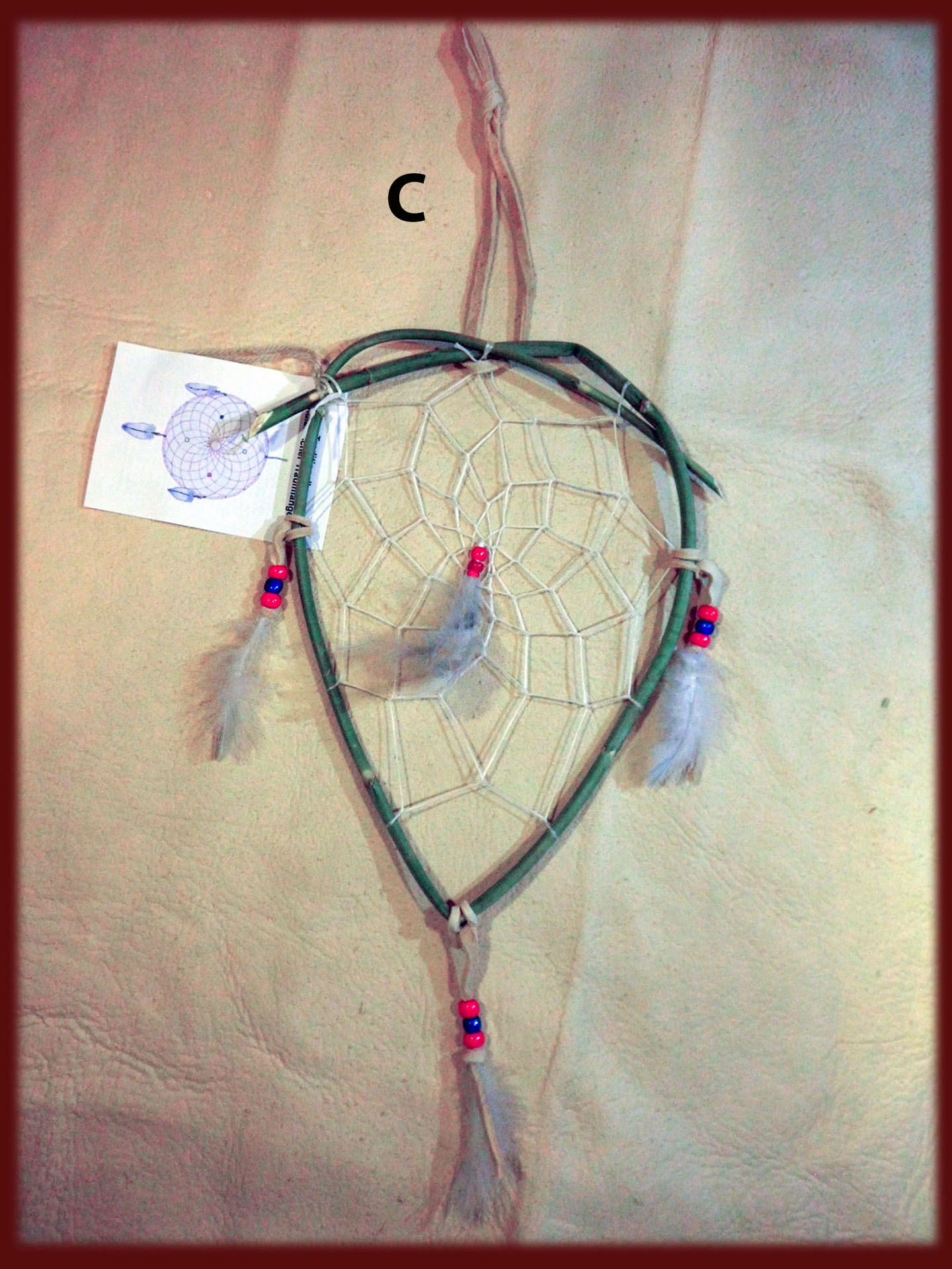 Weidenholz, Leder, Sehne, Perlen und Federn für gute Träume, die durch das Loch in der Mitte durchgelassen werden. Schlechte Träume verfangen sich im Netz und werden vom ersten Licht des neuen Tages zerstört.